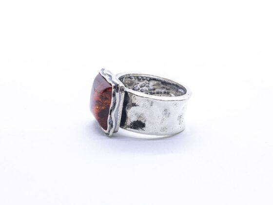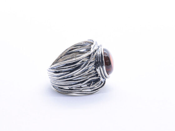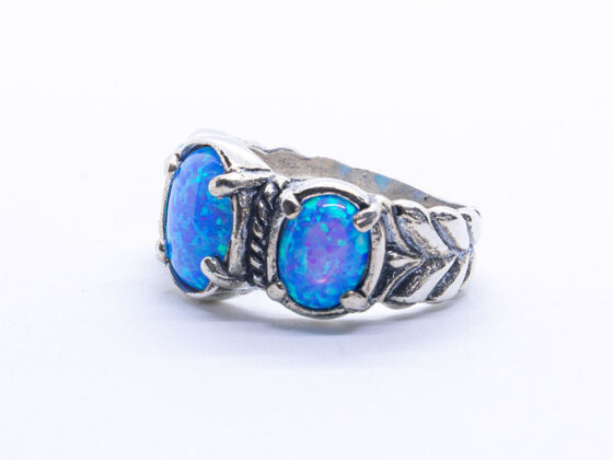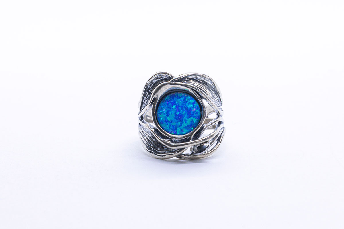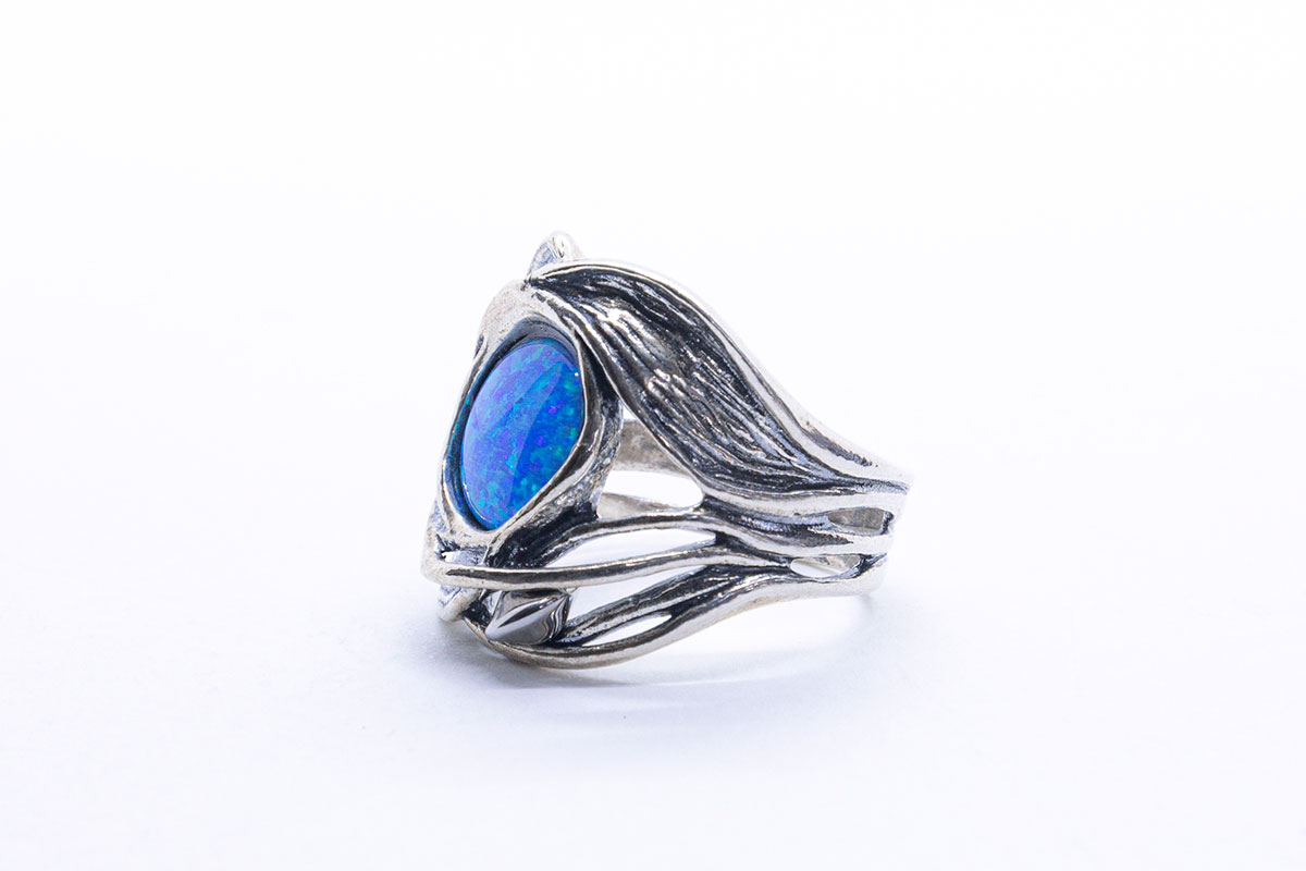 Anillo artesanal en Plata de 1ª Ley con ópalo noble. La estructura del aro está compuesta por líneas entrelazadas y ondulantes, creando una estética dinámica y elegante. En el centro se encuentra un ópalo azul profundo, con matices verdes y violetas. La gema está engastada de manera integrada en la forma del anillo, reforzando el estilo armonioso y envolvente de la pieza.