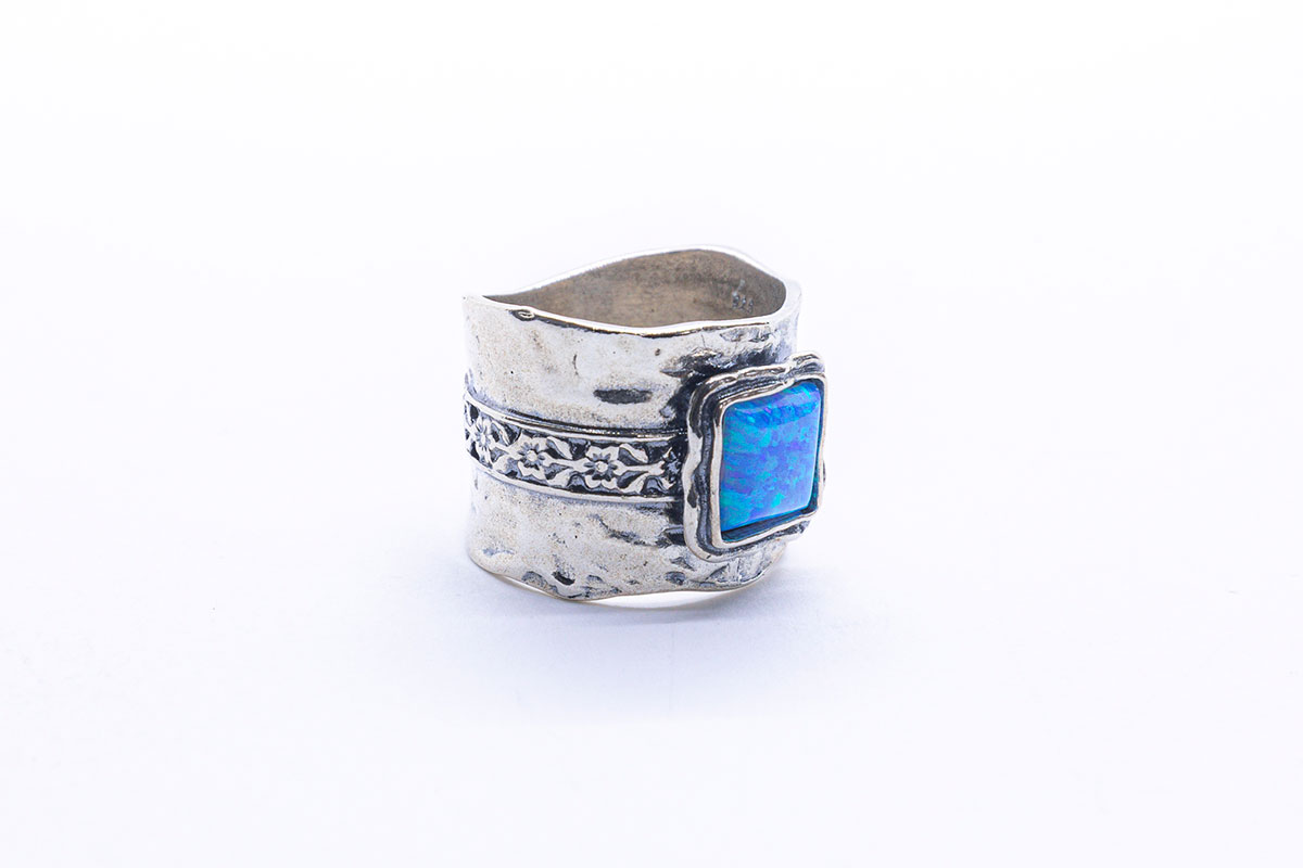 Anillo artesanal en Plata de 1ª Ley, diseñado con un aro ancho y una forma orgánica ligeramente ondulada que le aporta un carácter único. La superficie presenta un acabado texturizado, con detalles grabados en una franja central que añaden profundidad y un toque decorativo inspirado en motivos tradicionales. En el centro destaca un ópalo noble cuadrado de intenso color azul iridiscente, con matices que cambian entre tonos turquesa y violetas. La gema está montada en un marco cuadrado de plata que resalta su brillo y contraste.