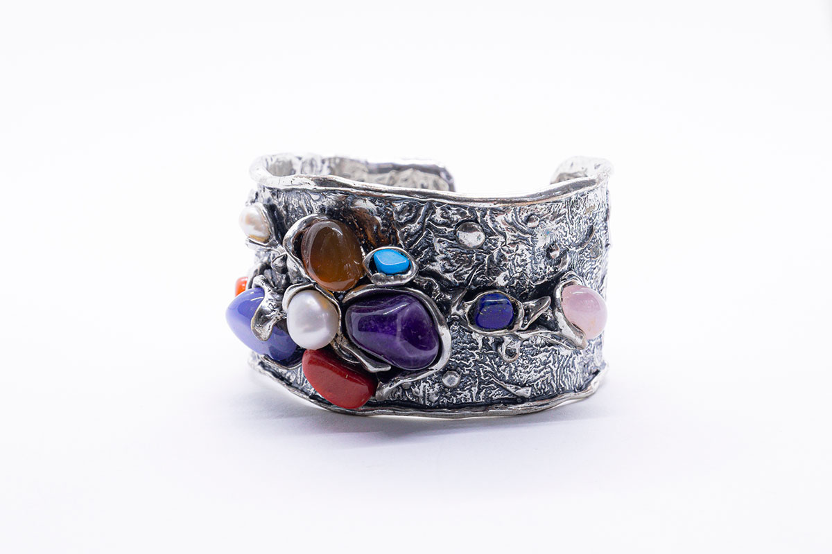 Brazalete realizado en plata de ley con gemas naturales: Lapislázuli, Perlas naturales, Coral, Amatista, Turquesa y Calcedonias.
