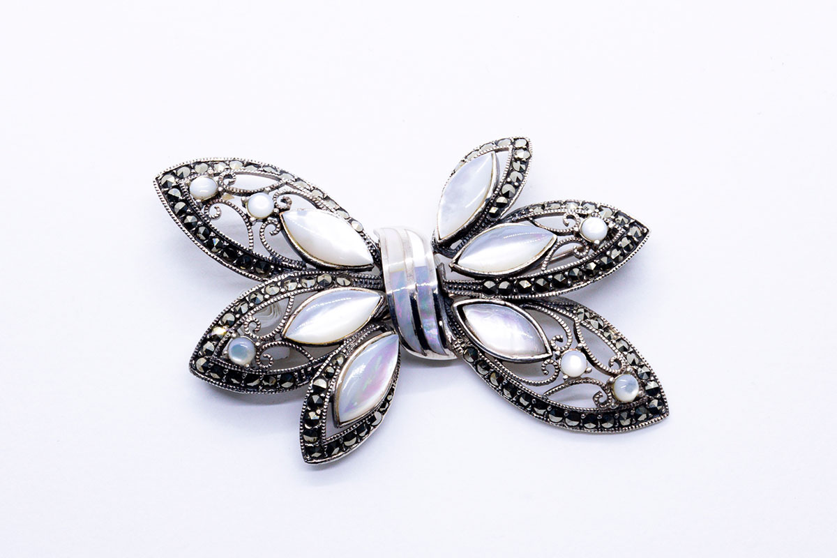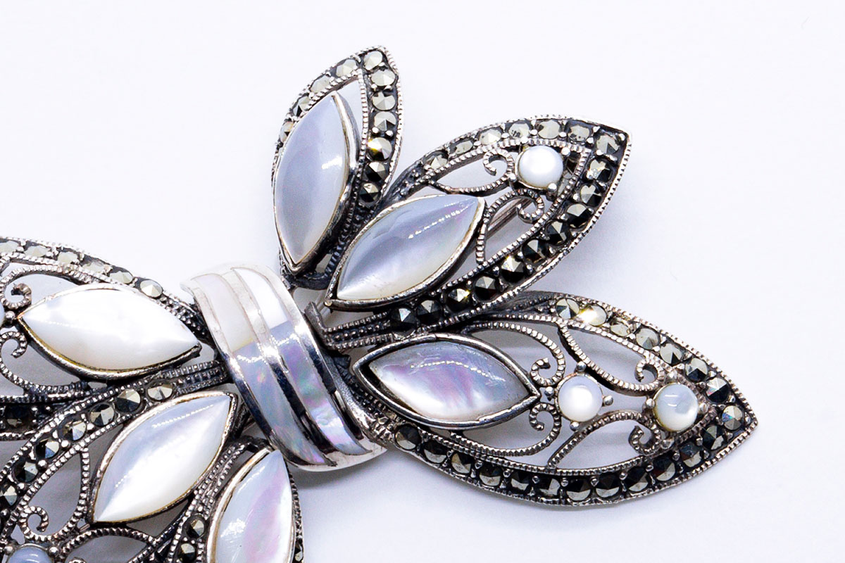 Peinecillo de plata y marcasitas con 5 flores de madreperla