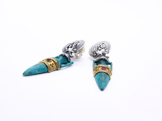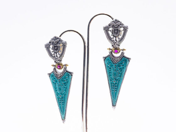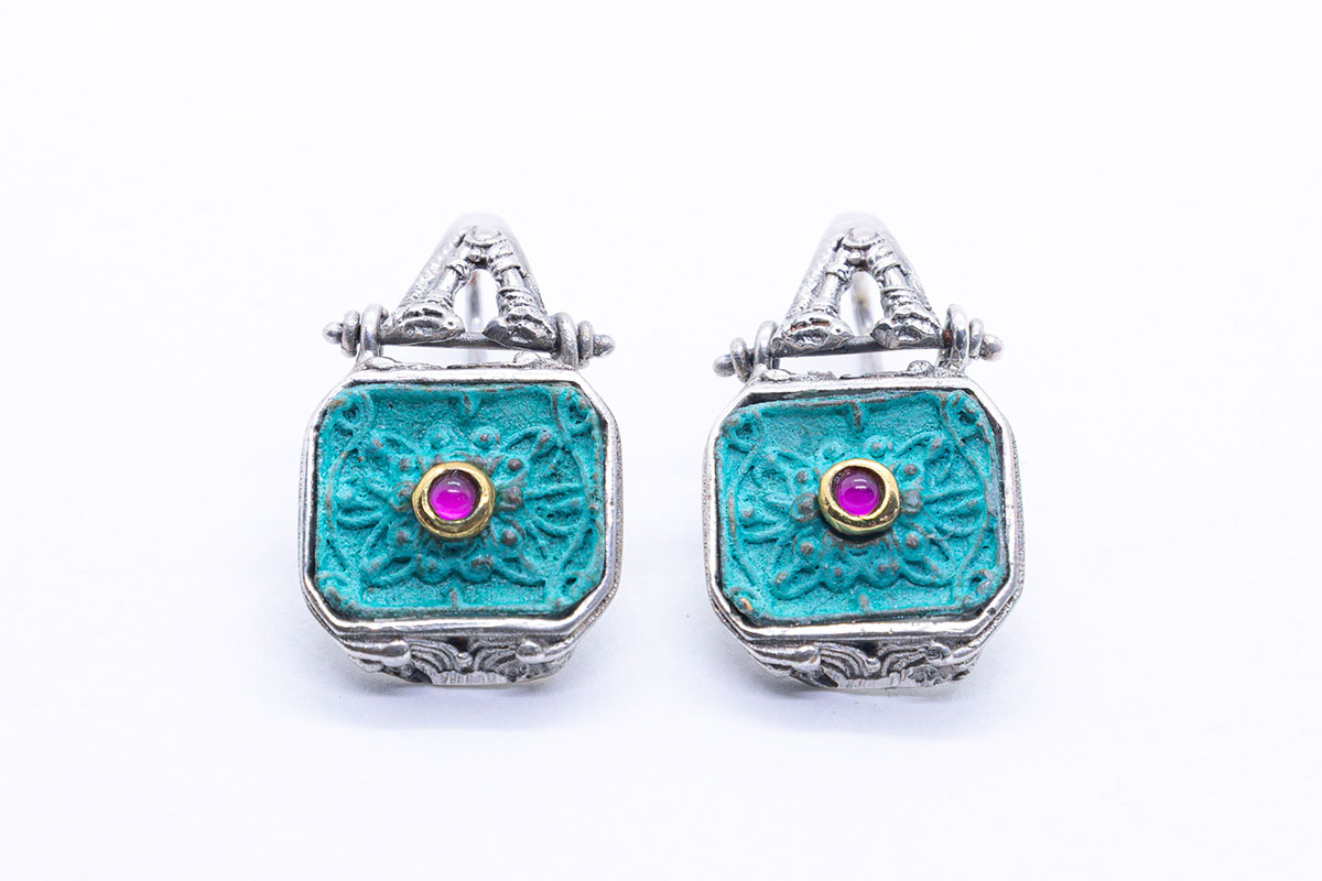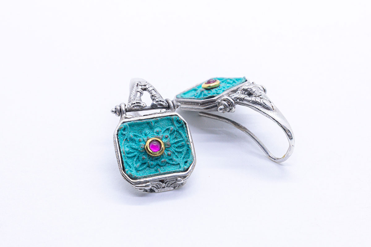 Pendientes de estilo etrusco en forma cuadrada realizados en plata de ley con apliques en bronce oxidado y rubíes hidrotermales.