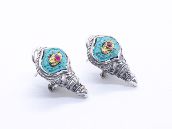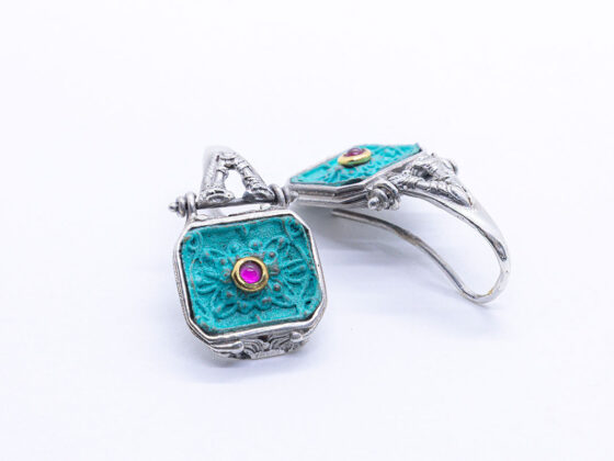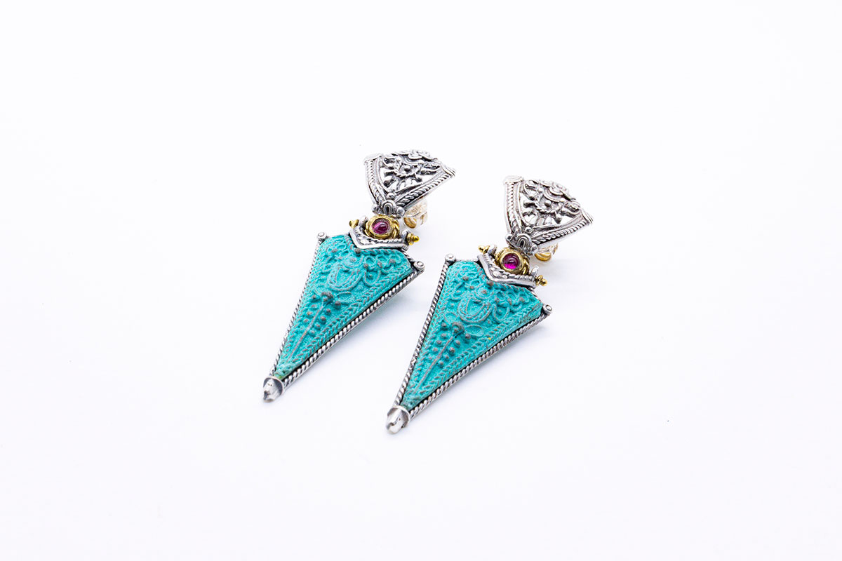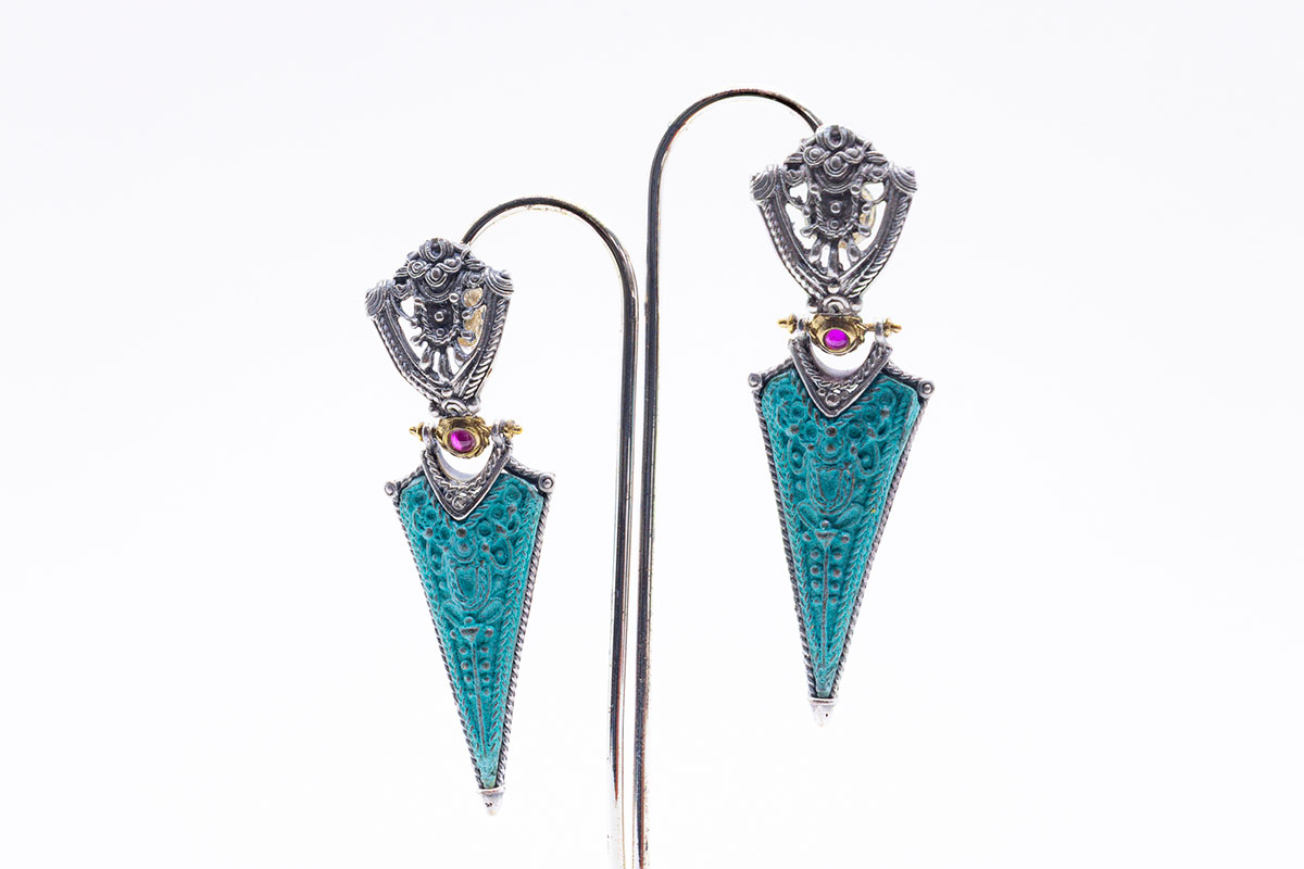 Pendientes largos de estilo etrusco realizados en plata de ley con apliques en bronce oxidado y rubíes hidrotermales con cierre Omega.
