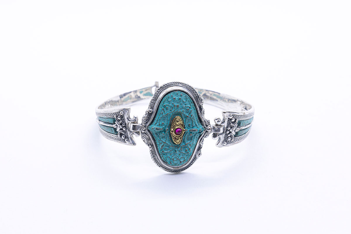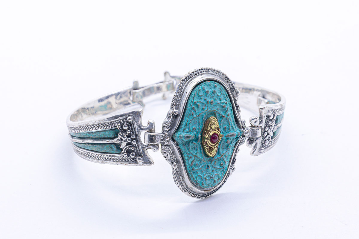 Pulsera de estilo etrusco en plata de ley con apliques en bronce oxidado y rubí hidrotermal.