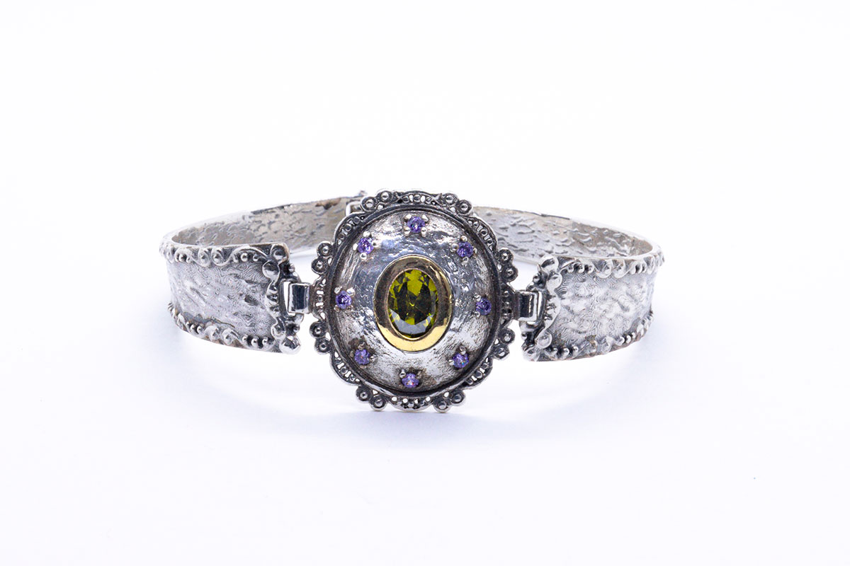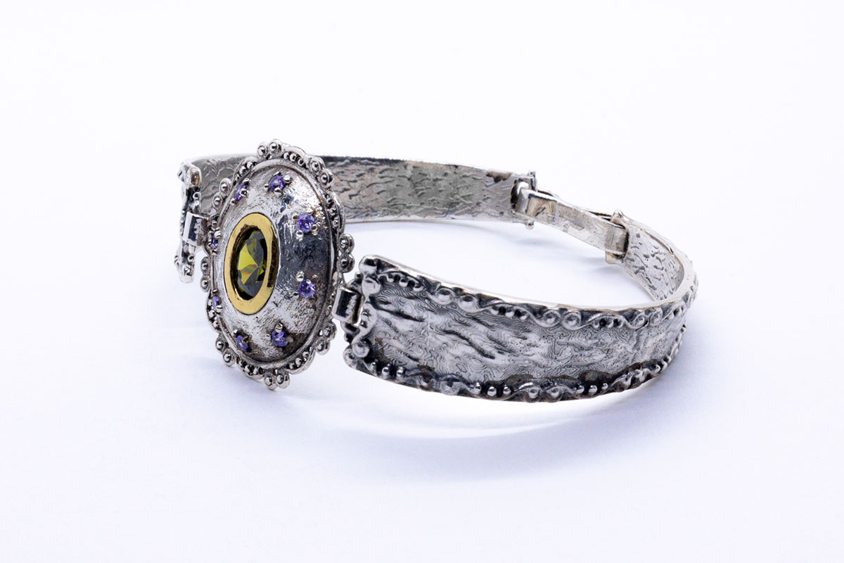 Pulsera realizada en plata de 1ª ley montado con cuarzos hidrotermales y apliques de Bronce